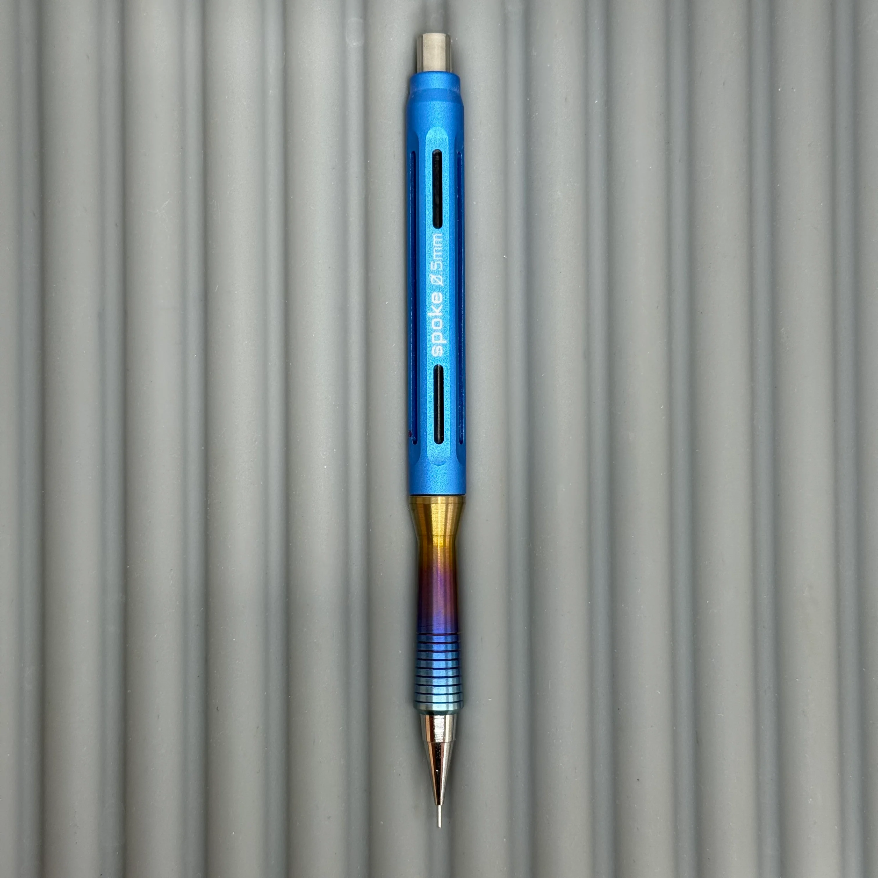 For this hack, we torched the Titanium inverse grip to give it the cool burnt gradient look. These are made via a manual process so they can be similar but not identical. The pencil is powered by a Pentel P205 0.5mm mechanism.